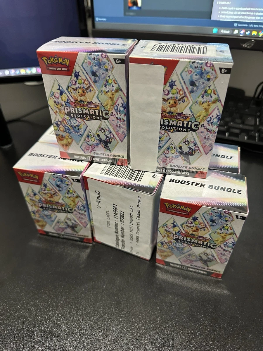 The Pokémon TCG: Scarlet & Violet – Prismatic Evolutions Booster Bundle includes 6 packs of standard-sized cards made from high-quality card stock. Each pack contains a total of 60 cards and is manufactured by The Pokémon Company in the United States. This set, released in 2025, features booster packs specifically designed for ages 6 and up, offering a delightful addition to any Pokémon TCG collection. The bundle includes cards from the Prismatic Evolutions set, providing players with a variety of exciting and colourful designs to enhance their gameplay experience. 1 box per order. No cancellations or returns.